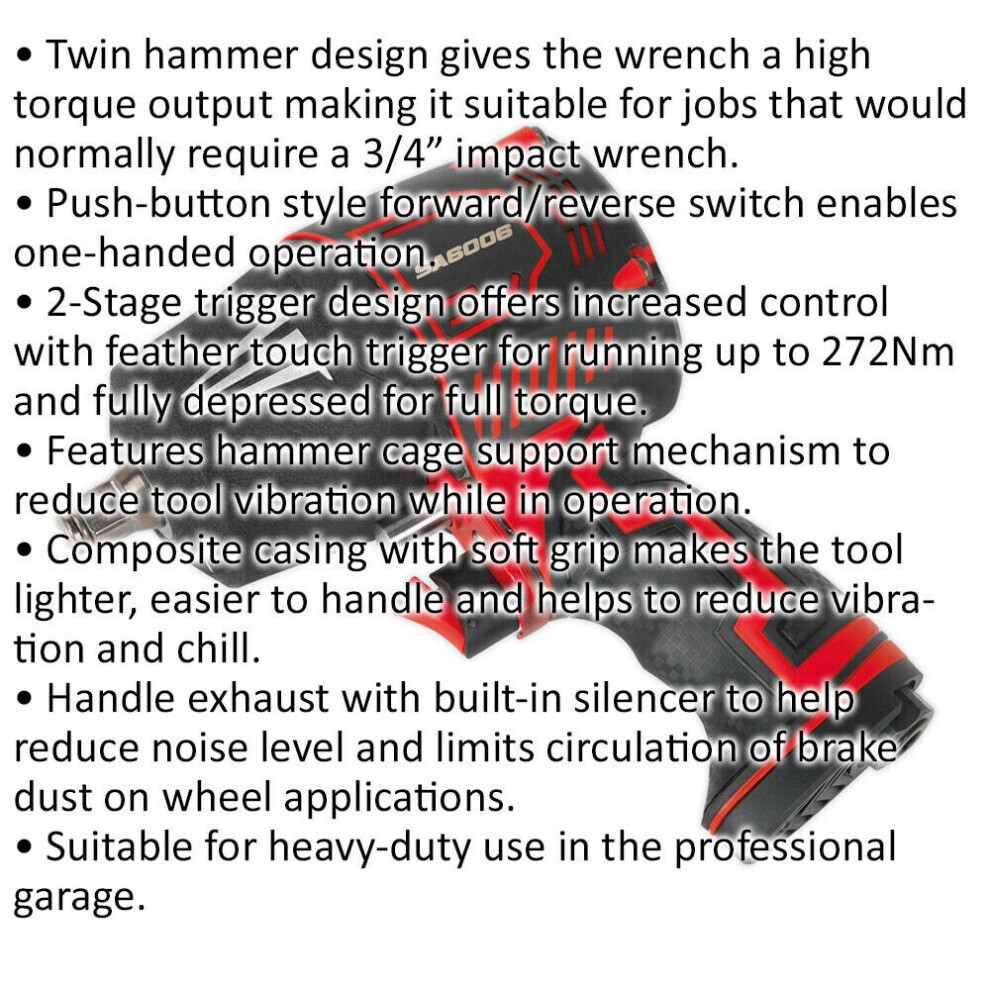 Twin hammer design gives the wrench a high torque output making it suitable for jobs that would normally require a 3/4" impact wrench. Push-button style forward/reverse switch enables one-handed operation. 2-Stage trigger design offers increased control with feather touch trigger for running up to 272Nm and fully depressed for full torque. Features hammer cage support mechanism to reduce tool vibration while in operation. Composite casing with soft grip makes the tool lighter, easier to handle and helps to reduce vibration and chill. Handle exhaust with built-in silencer to help reduce noise level and limits circulation of brake dust on wheel applications. Suitable for heavy-duty use in the professional garage.