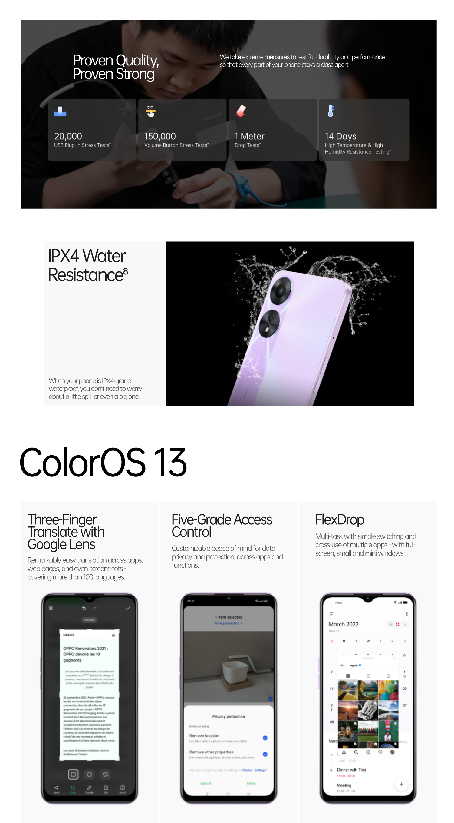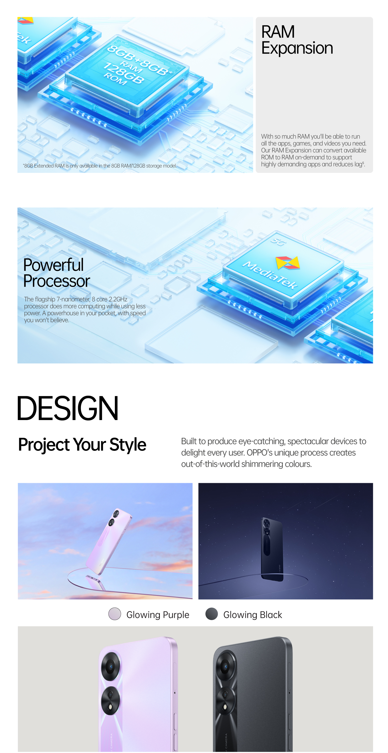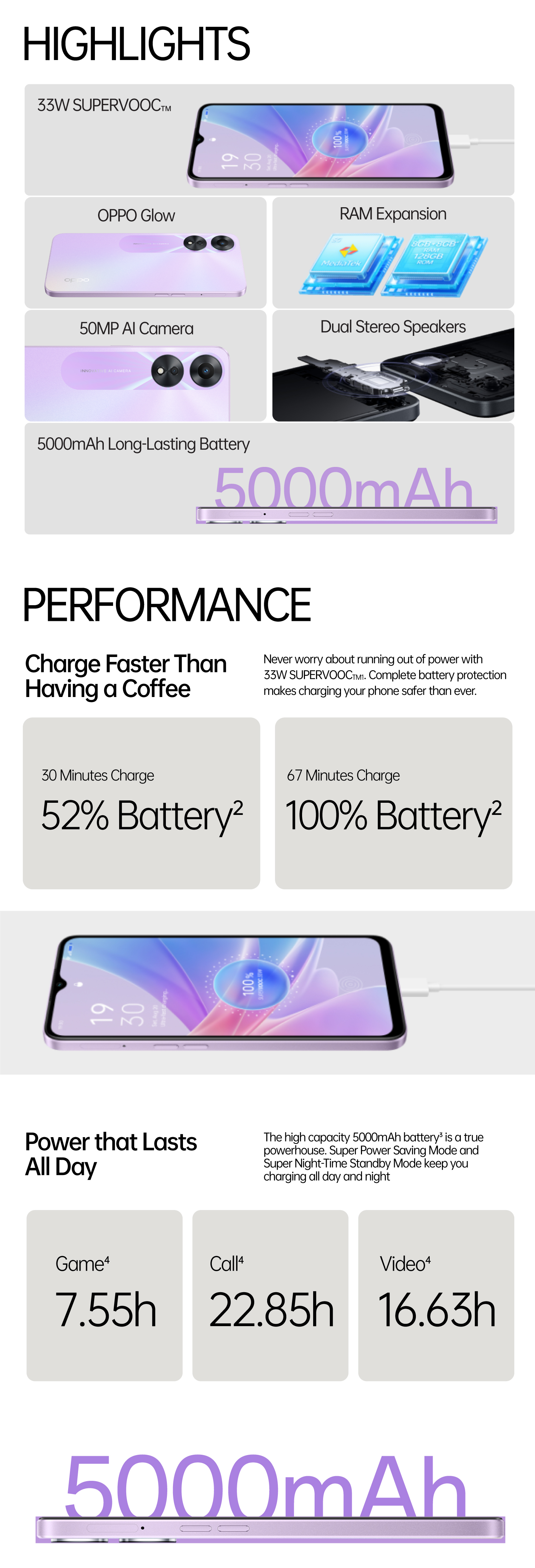 Never worry about running out of power with 33W SUPERVOOC™¹. Complete battery protection makes charging your phone safer than ever. The high capacity 5000mAh battery³ is a true powerhouse. Super Power Saving Mode and Super Night-time Standby Mode keep you charged all day and night.