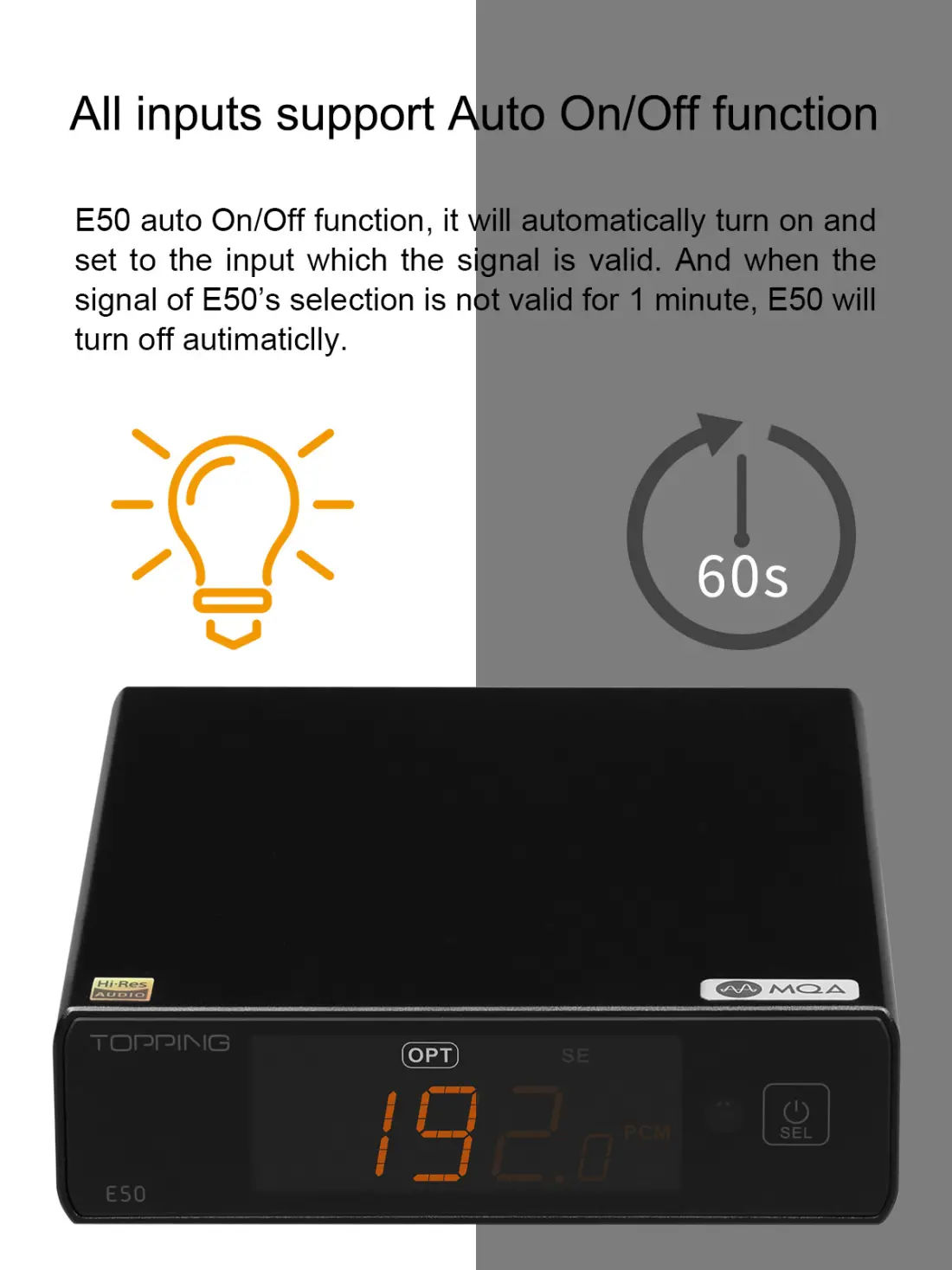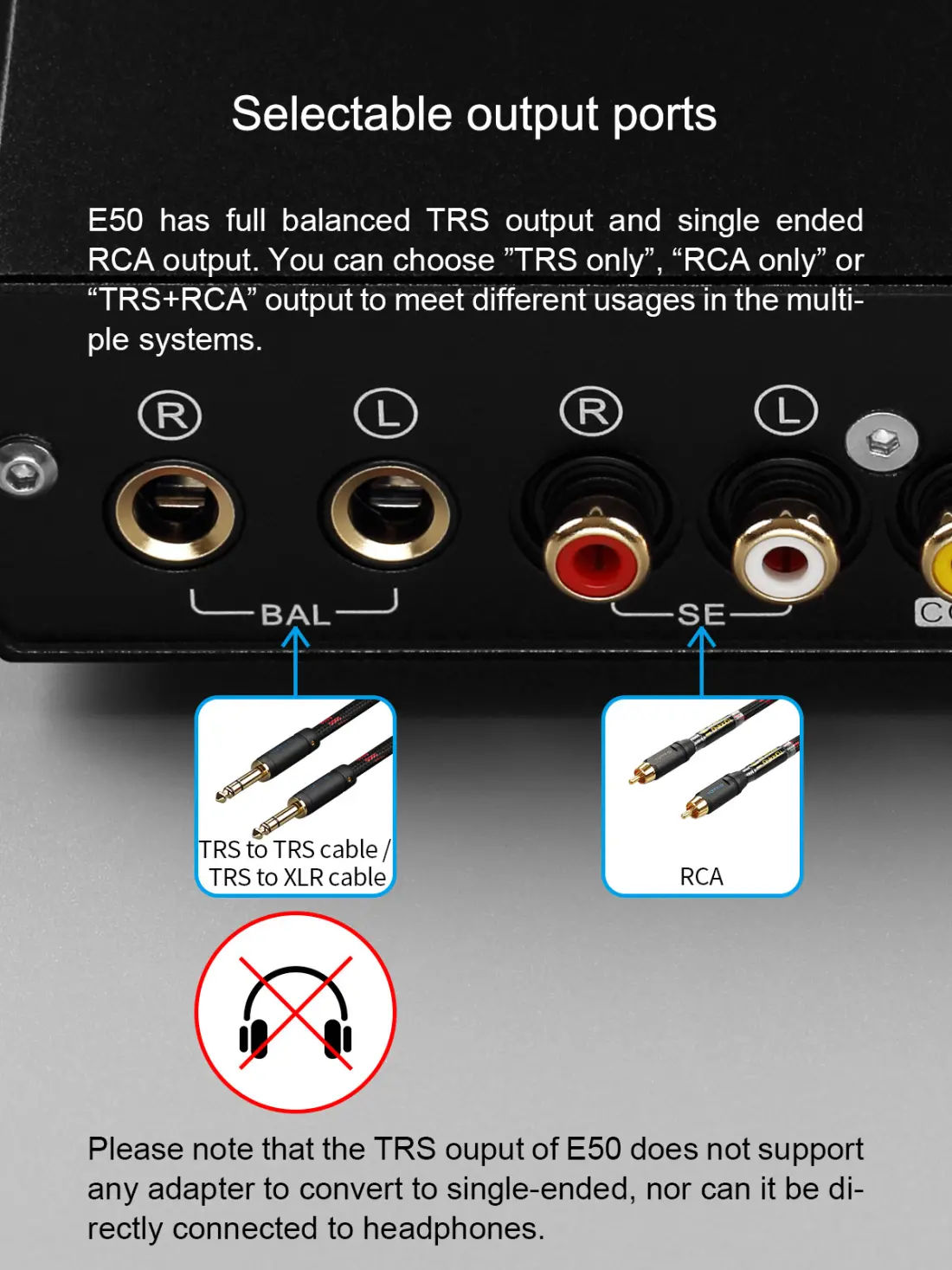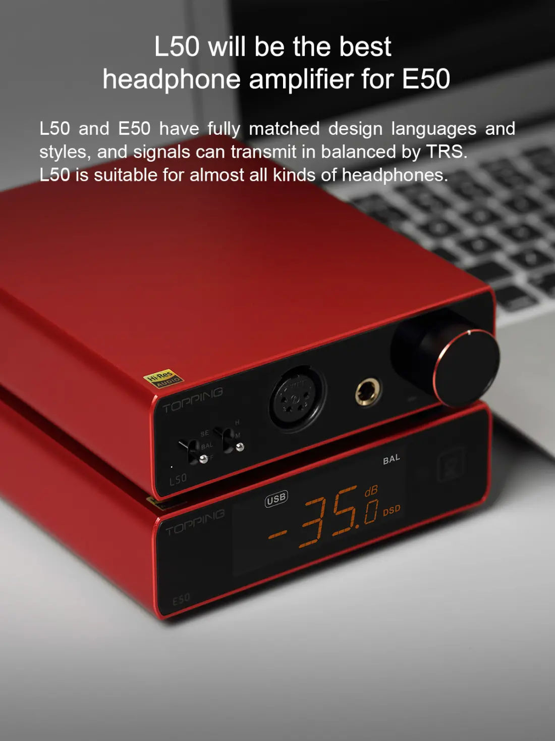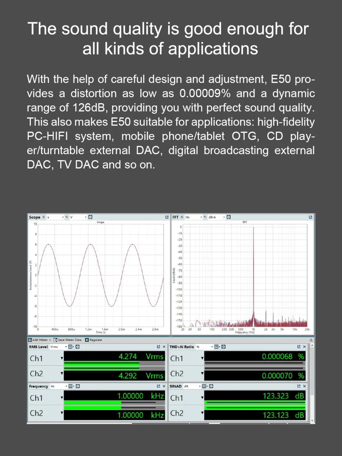 With the help of careful design and adjustment, E50 provides a distortion as low as 0.00009% and a dynamic range of 126dB, providing you with perfect sound quality.