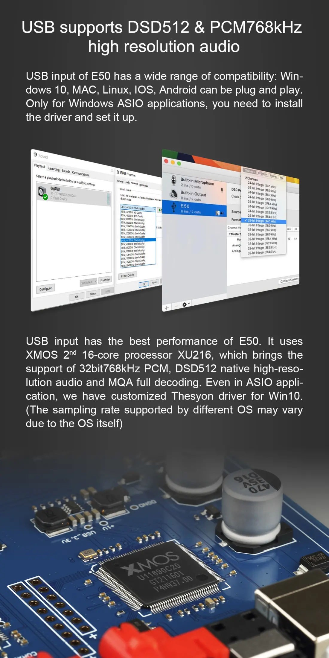 This also makes E50 suitable for applications: high-fidelity PC-HIFI system, mobile phone/tablet OTG, CD player/turntable external DAC, digital broadcasting external DAC, TV DAC, and so on.