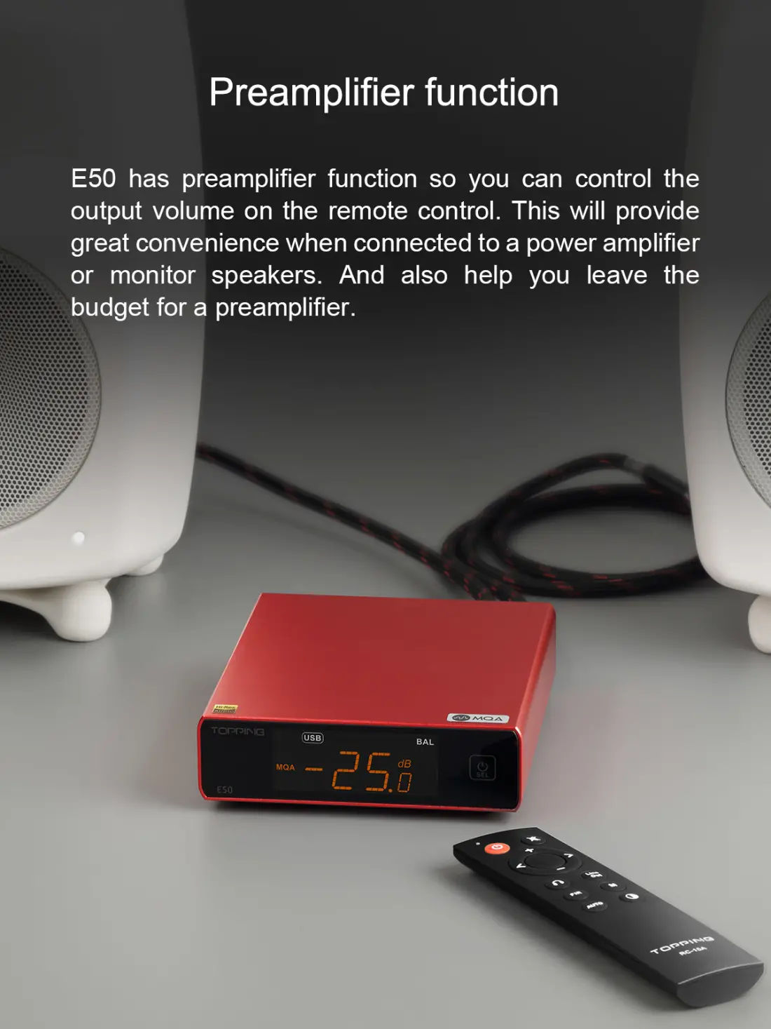 E50 has a preamplifier function so you can control the output volume on the remote control. This will provide great convenience when connected to a power amplifier
